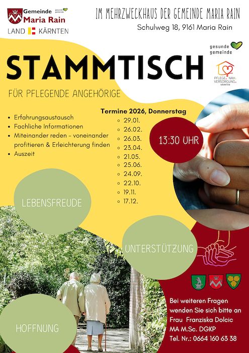 Der Stammtisch für pflegende Angehörige bietet Raum für offenen Erfahrungsaustausch und gegenseitige Unterstützung. Zusätzlich erhalten Sie fachliche Informationen durch eine diplomierte Gesundheits- und Krankenpflegekraft. In regelmäßigen Abständen werden Fachvorträge sowie moderierte Diskussionsrunden zu pflegerelevanten Themen angeboten.