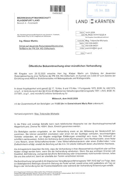 Bezirkshauptmannschaft Klagenfurt-Land – Öffentliche Bekanntmachung mündliche Verhandlung