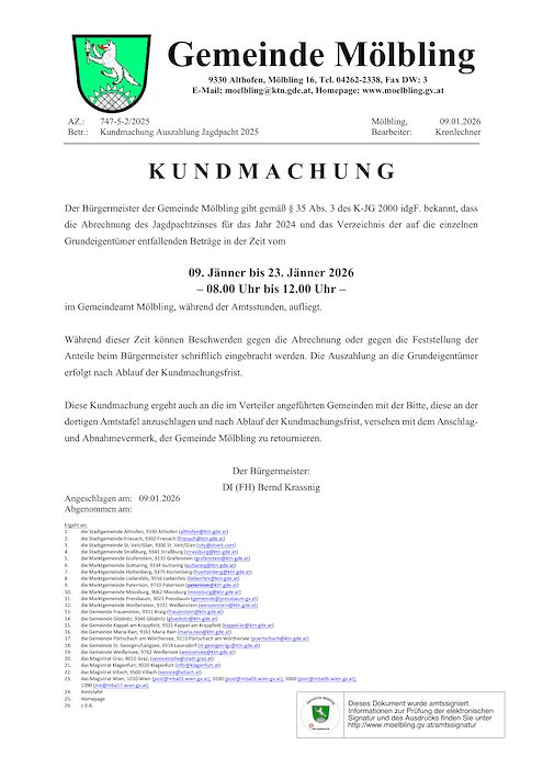 Gemeinde Mölbling – Kundmachung für die Auszahlung Jagdpacht 2025