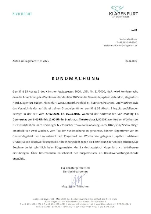 Kundmachung Anteil Jagdpachtzins 2025