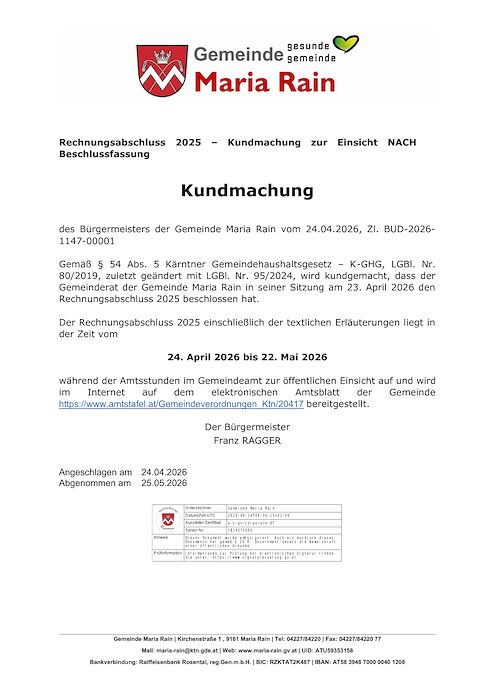 Kundmachung Rechnungsabschluss 2025 – zur Einsicht nach Beschlussfassung