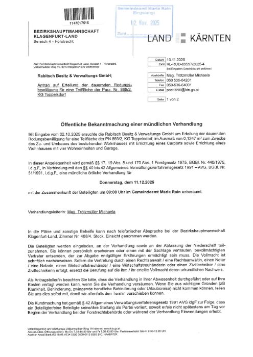 Öffentliche Bekanntmachung einer mündlichen Verhandlung